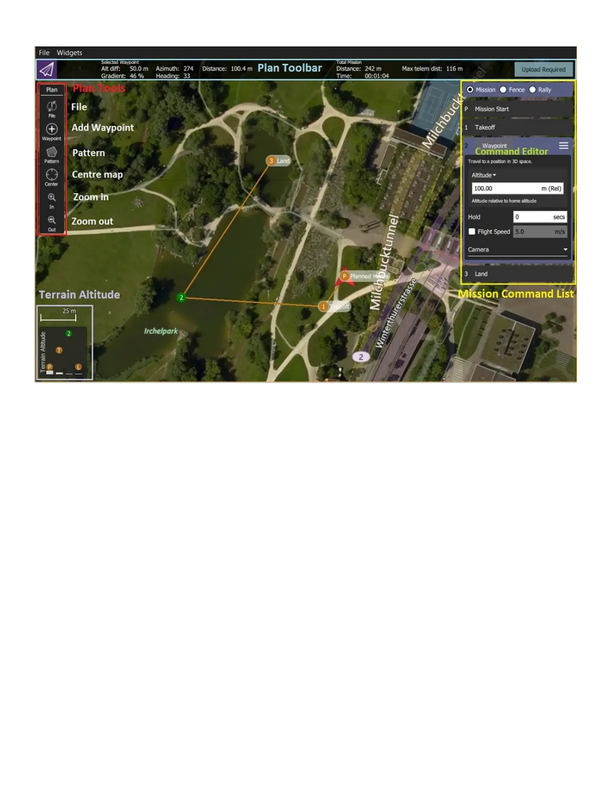 Detailed waypoint list can be used to give commands at each waypoint. Command menu
