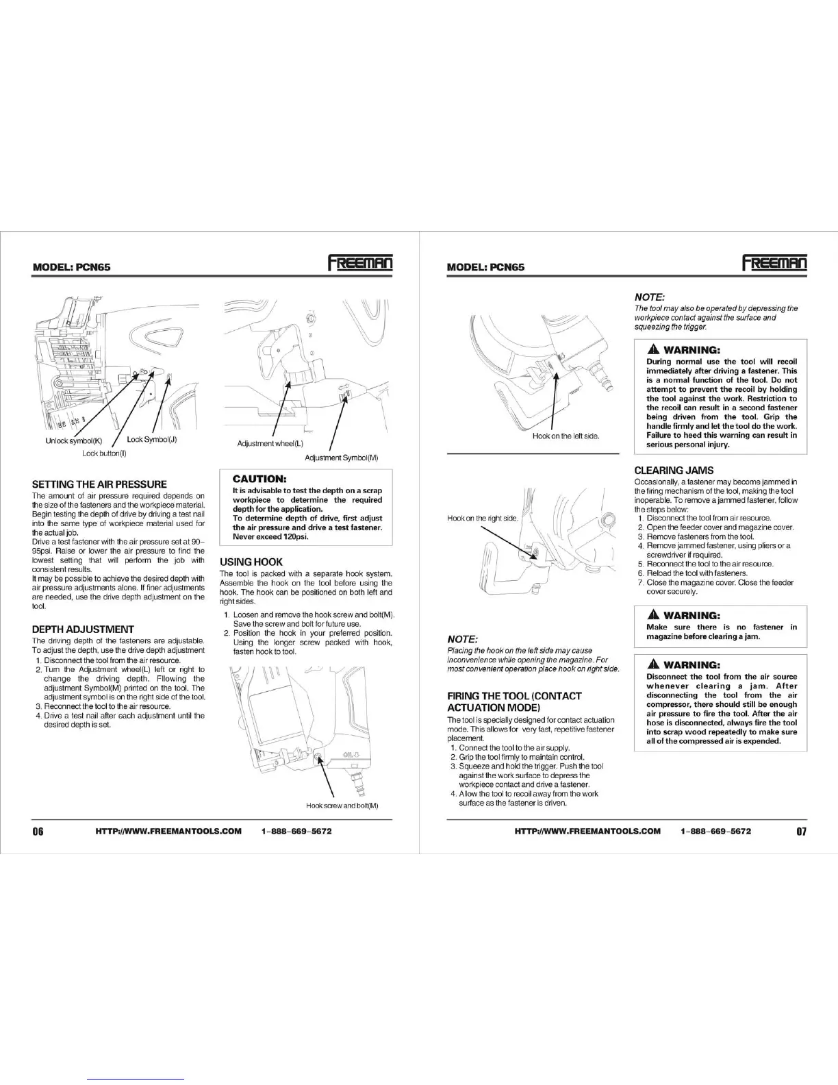 Freeman PCN65 - Setting and Depth Adjustment; Setting Air Pressure; Depth Adjustment; Tool Firing and Jam Clearing