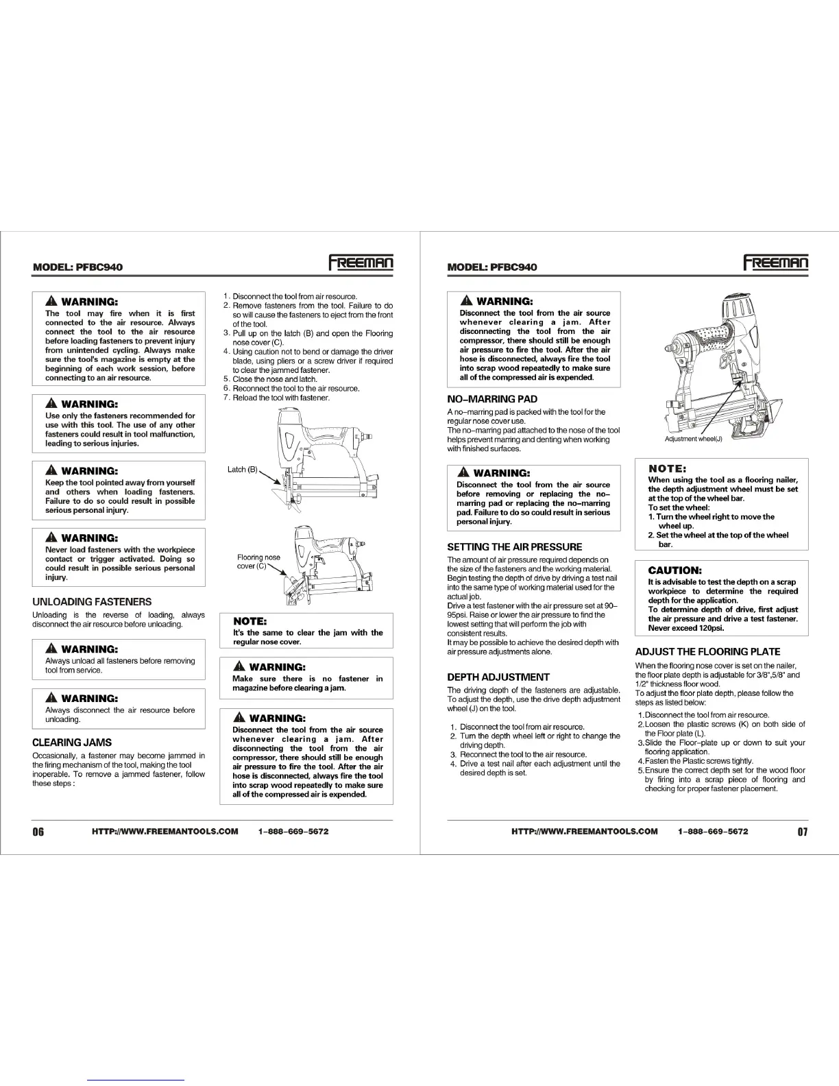 Freeman PFBC940 - Safety and Loading Procedures; Loading Fastener Safety; Unloading and Clearing Jams; No-Marring Pad Usage