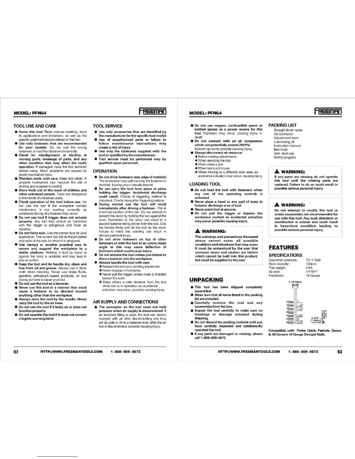Freeman PFN64 - Tool Use and Care; Tool Service; Operation; Loading Fasteners