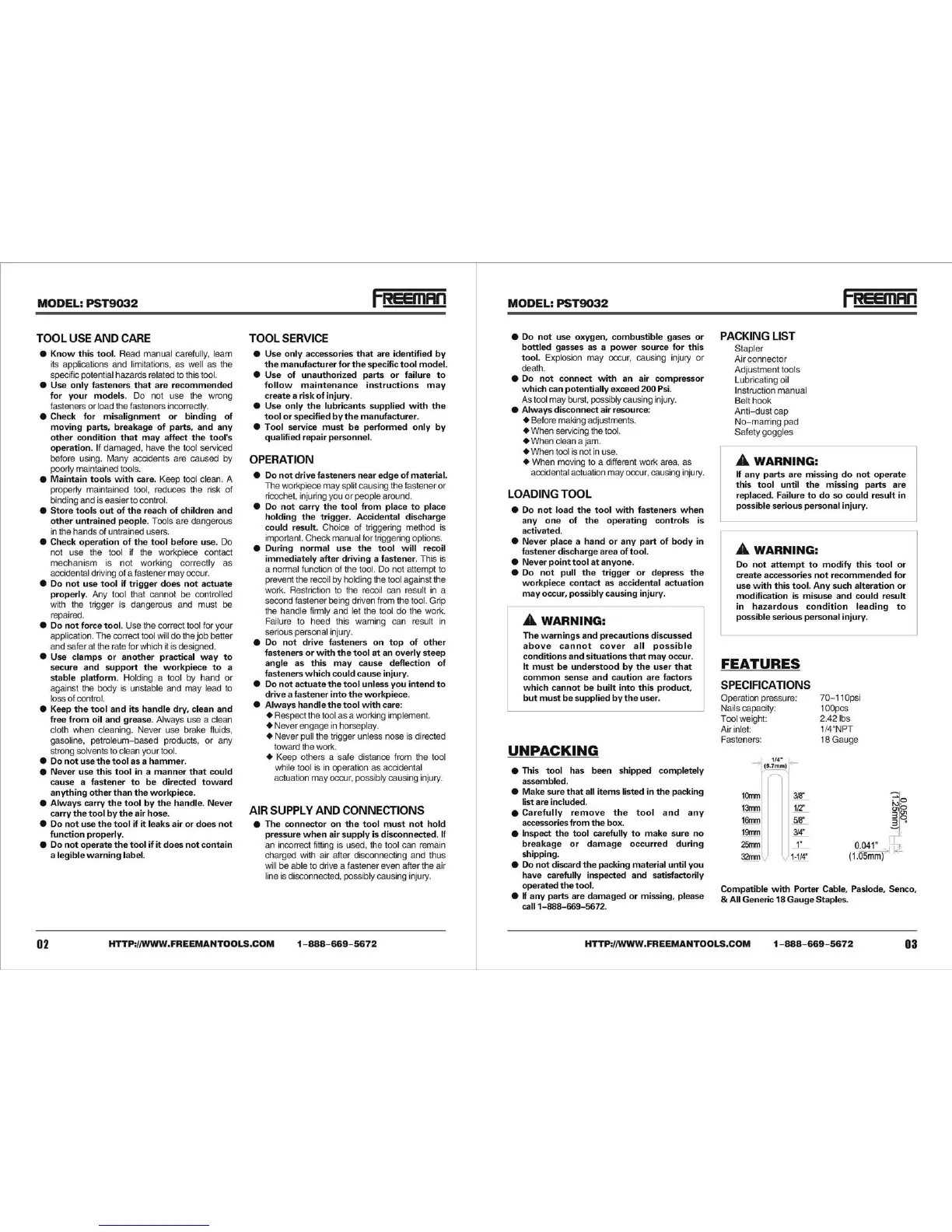 Freeman PST9032 - Tool Use and Care; Tool Service; Operation; Air Supply and Connections