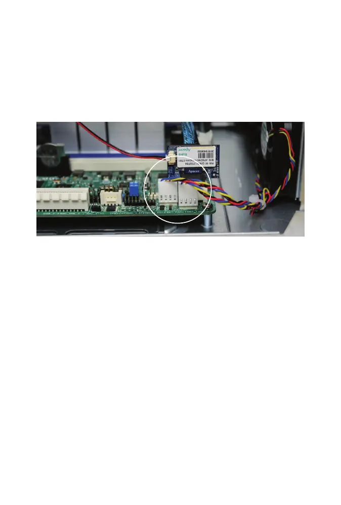 SATADOM. Gently press the white fan cable connector down until it is fully