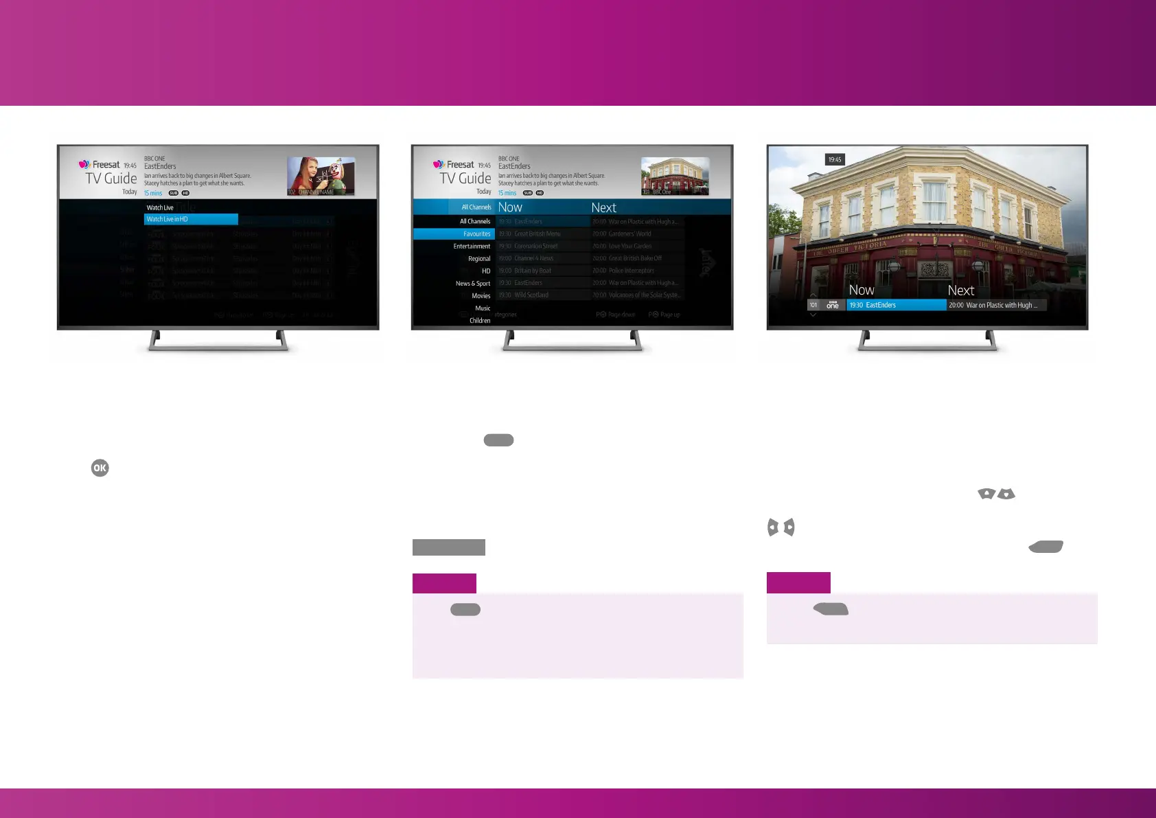 For a quick snapshot of what’s on now and next, press any