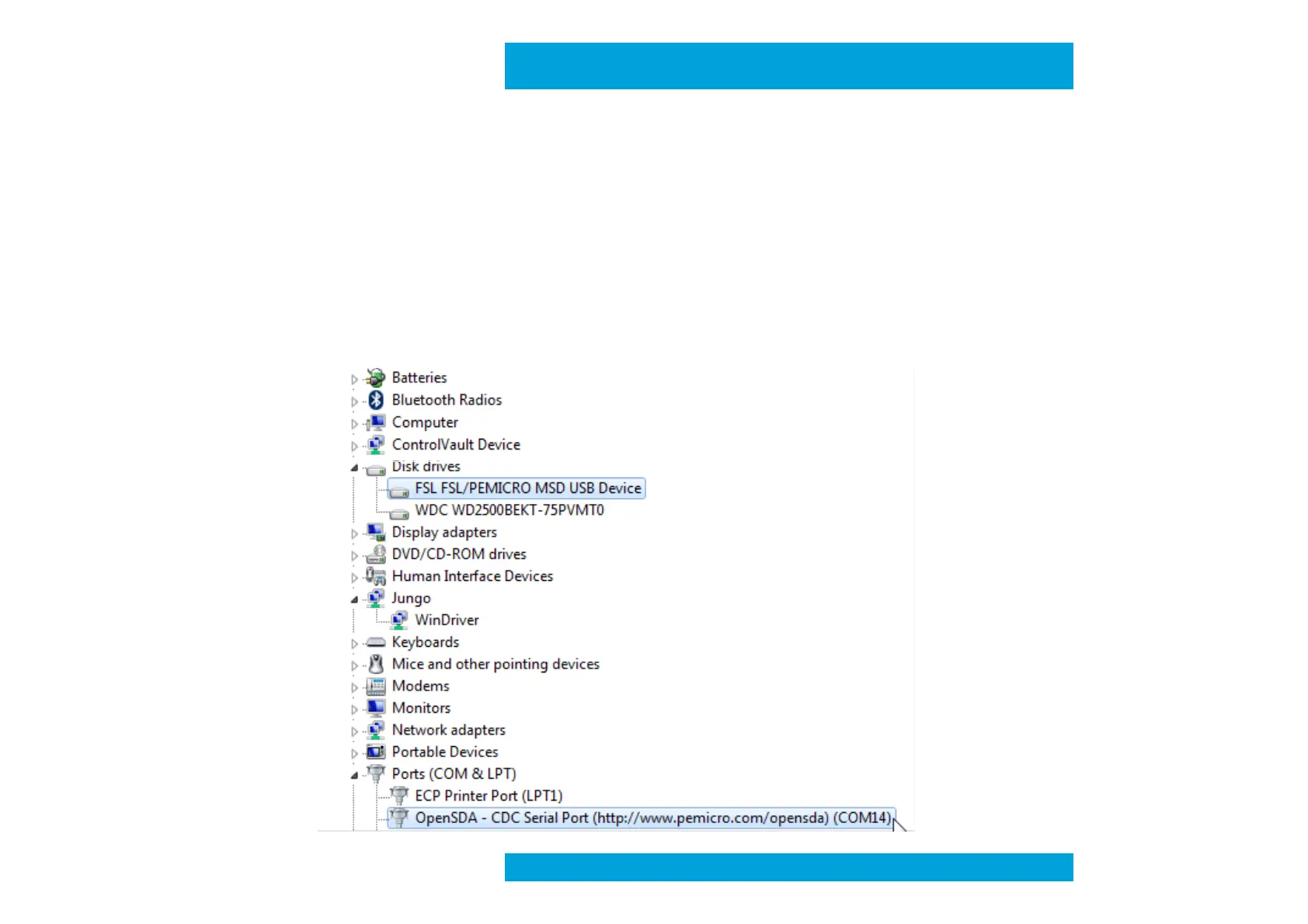 • Check in Windows device manager that Ports (COM & LPT)/OpenSDA-CDC Serial Port was