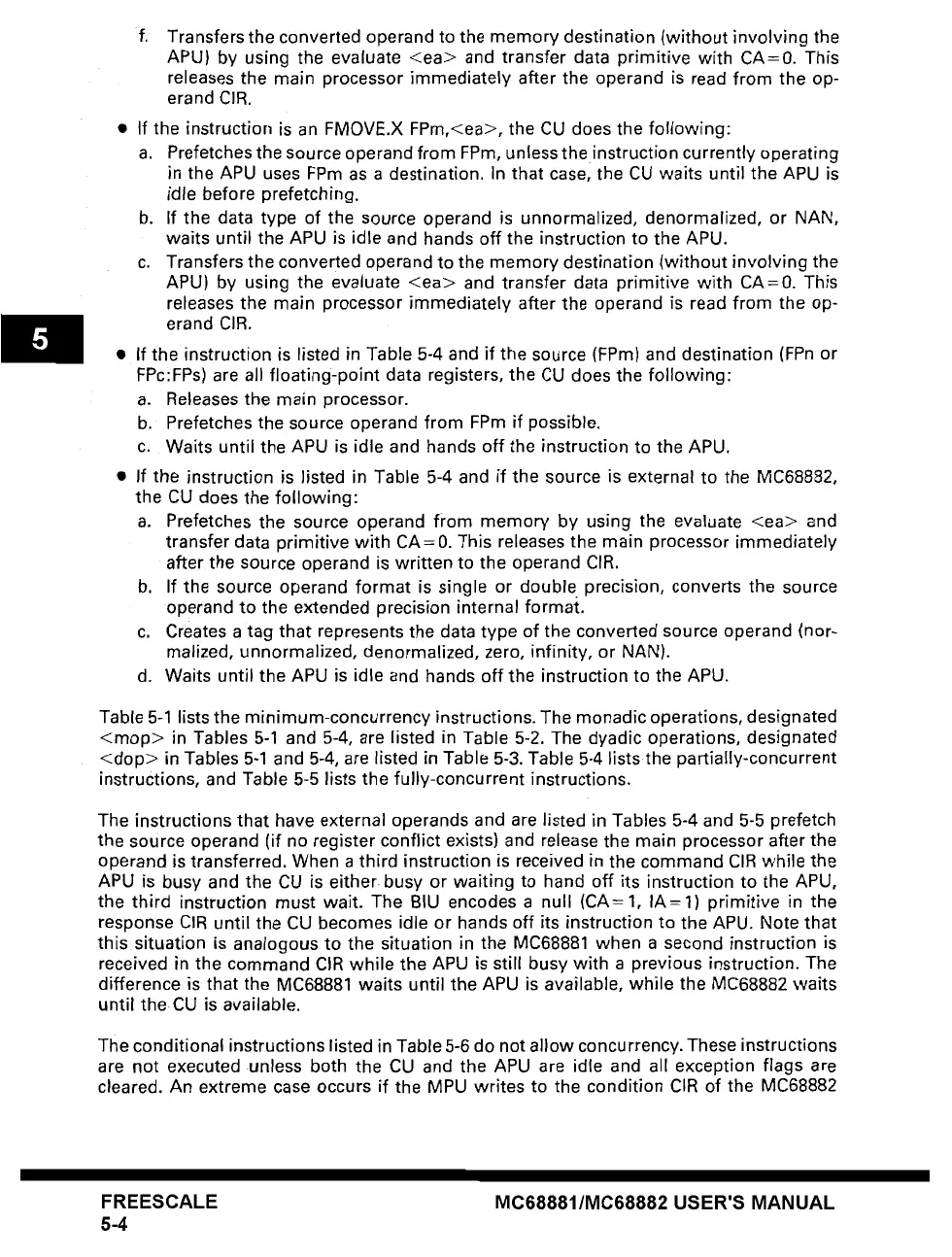 • If the instruction is listed in Table 5-4 and if the source is external to the MC68882,