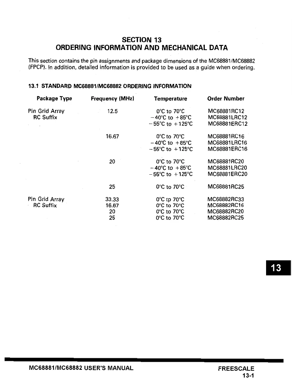 13.1 STANDARD MC68881/MC68882 ORDERING INFORMATION