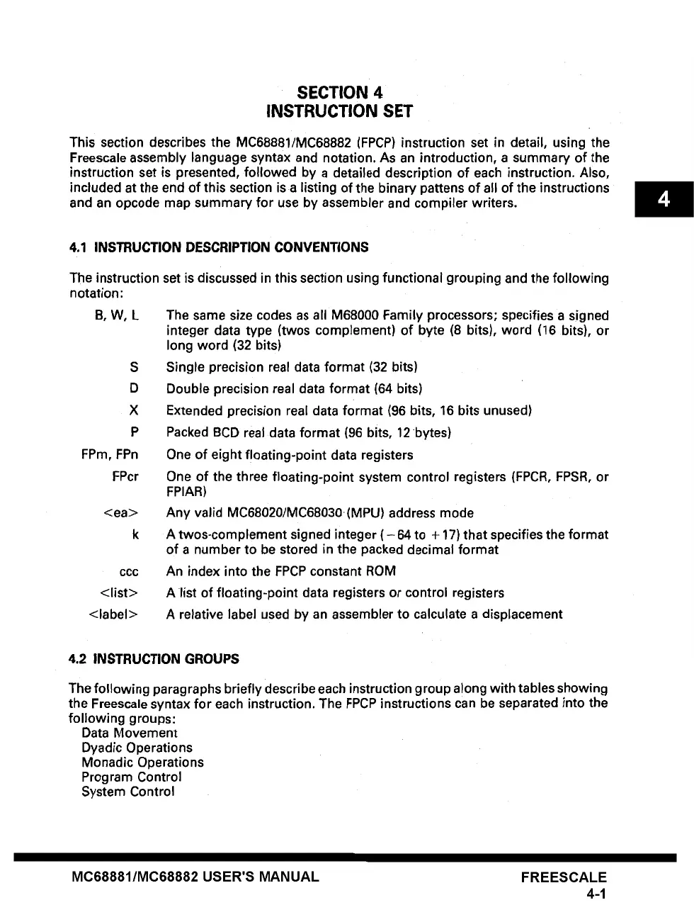 This section describes the MC68881/MC68882 (FPCP) instruction set in detail, using the