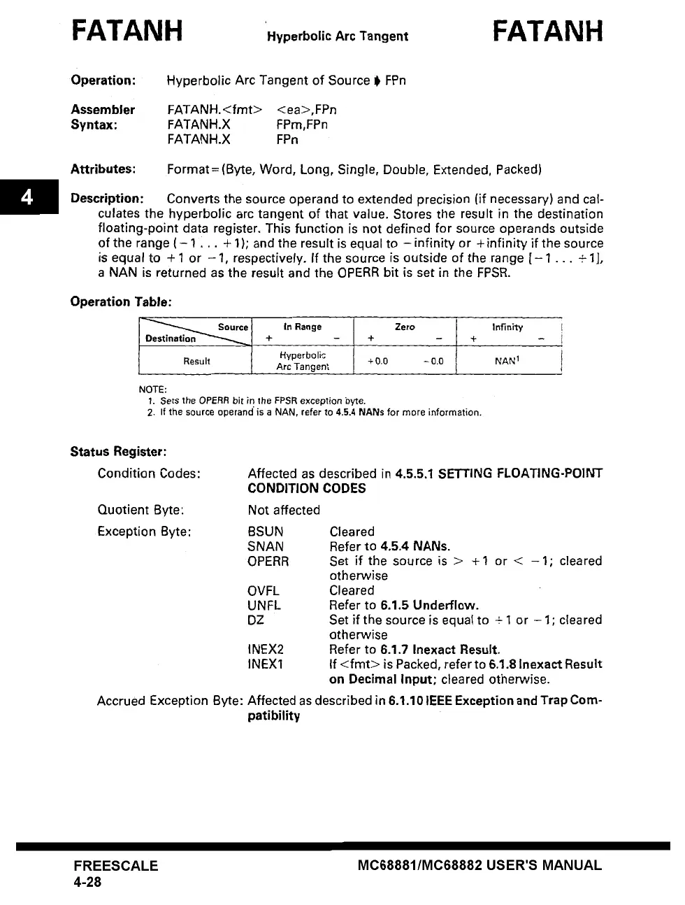 culates the hyperbolic arc tangent of that value. Stores the result in the destination