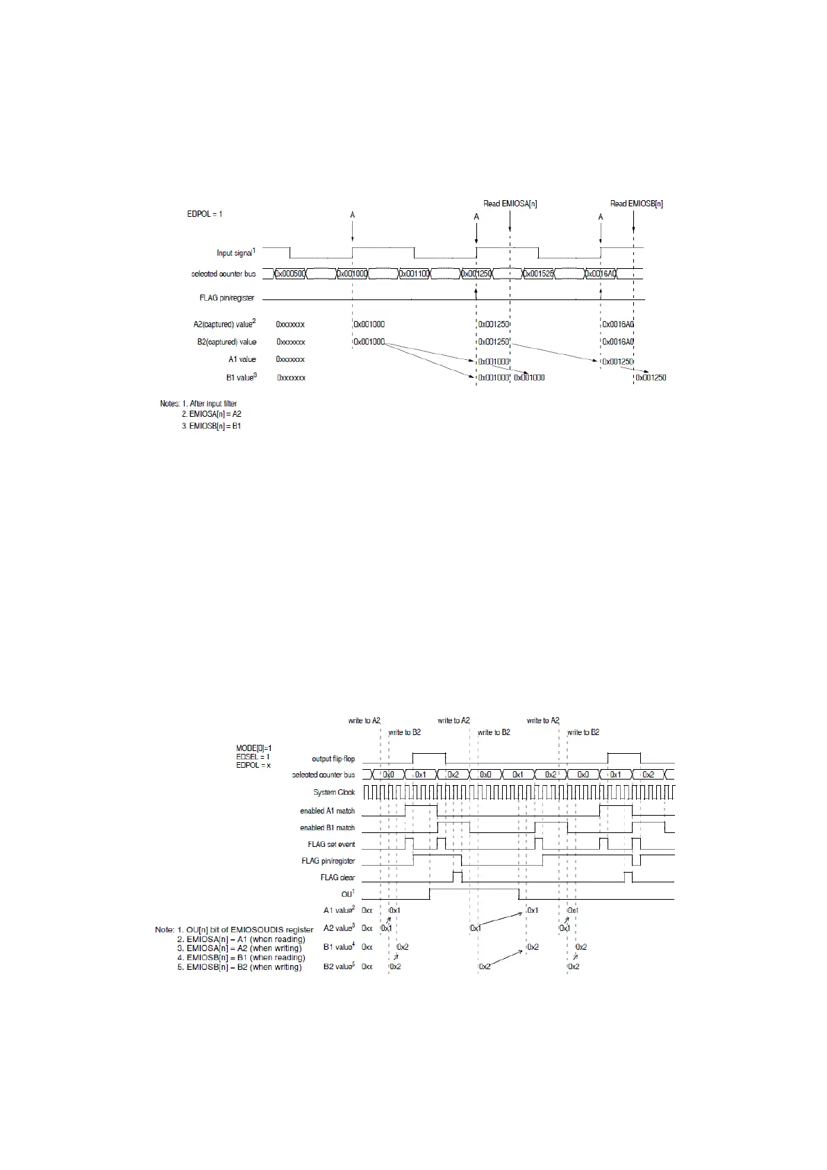 When a match occurs on register A, the output is set to EDPOL, and on a match on register B, it is