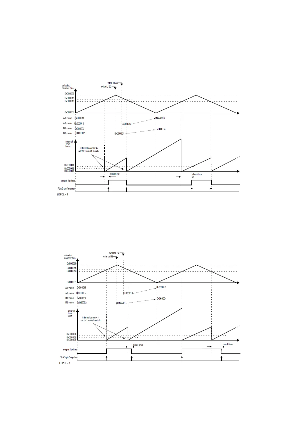 The Center Aligned Output PWM Buffered with Dead-Time mode (MODE[0:6]=10111bb) is