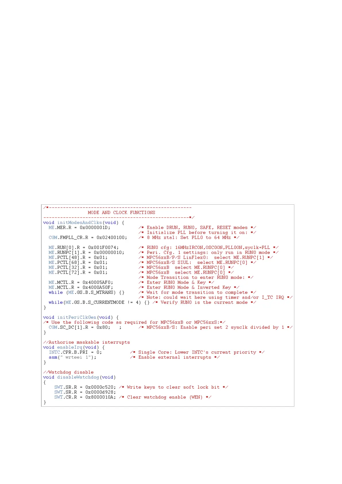 Typical functions for enabling interrupt requests and disabling SWT watchdog are also needed.