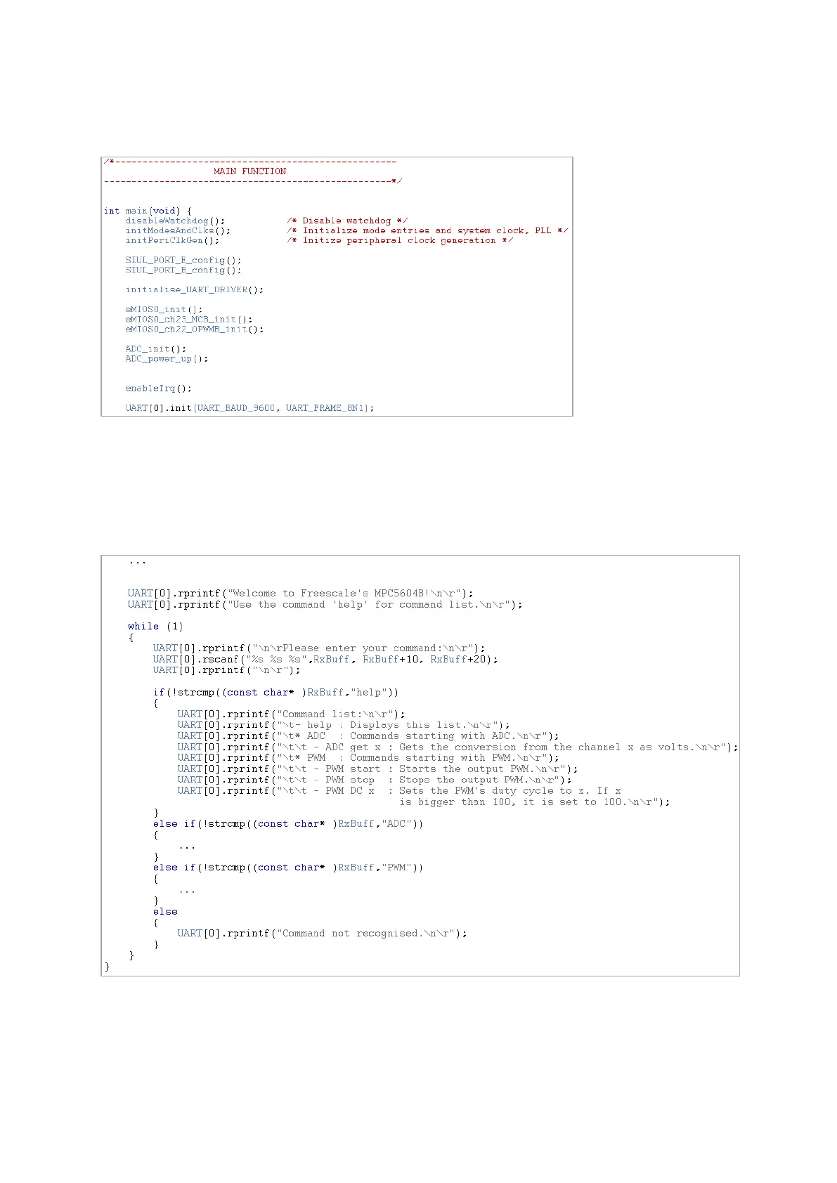 The main function starts by initializing the system and configuring peripherals. UART driver is