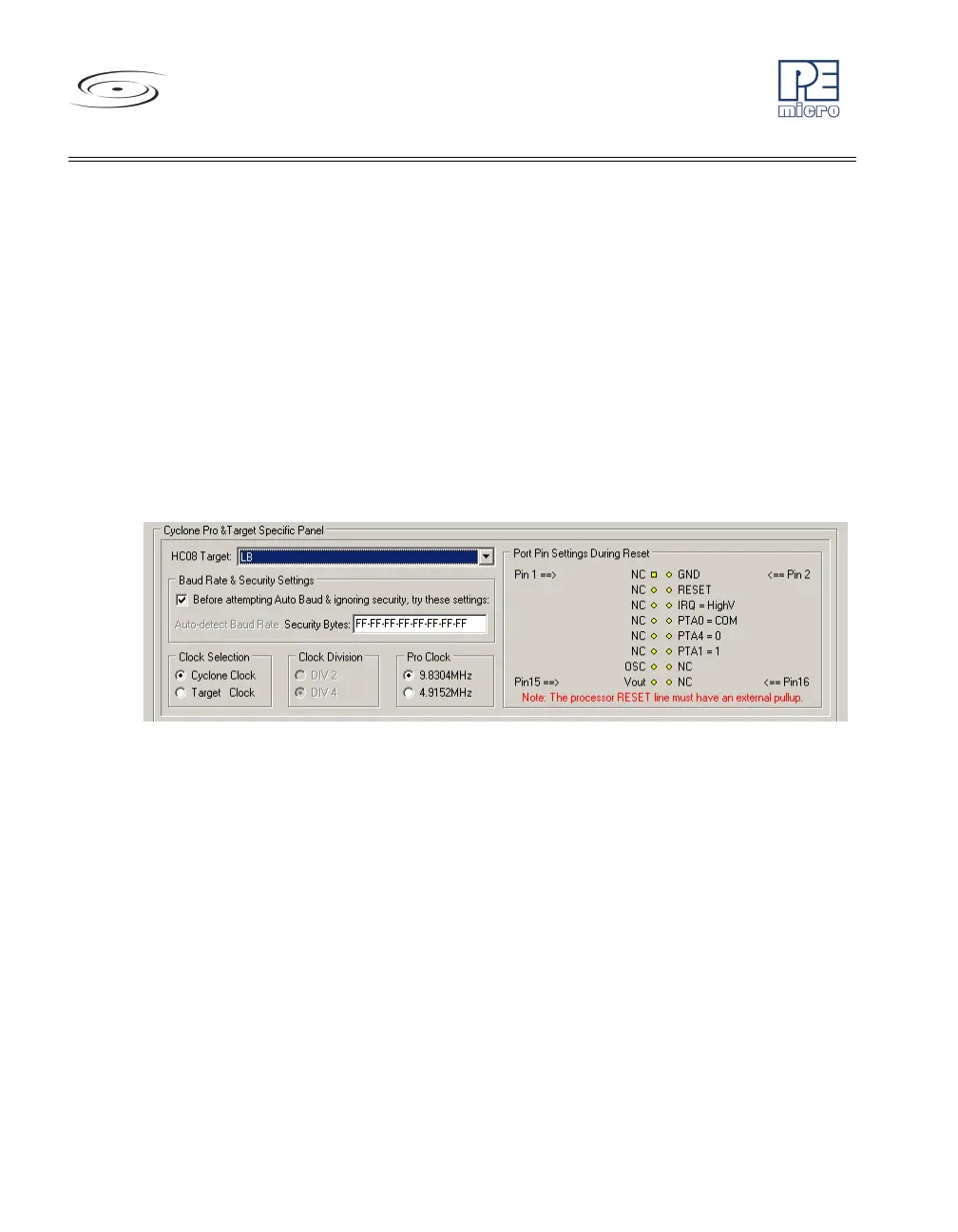 An external clock signal must be provided to the target MCU’s OSC pin. The