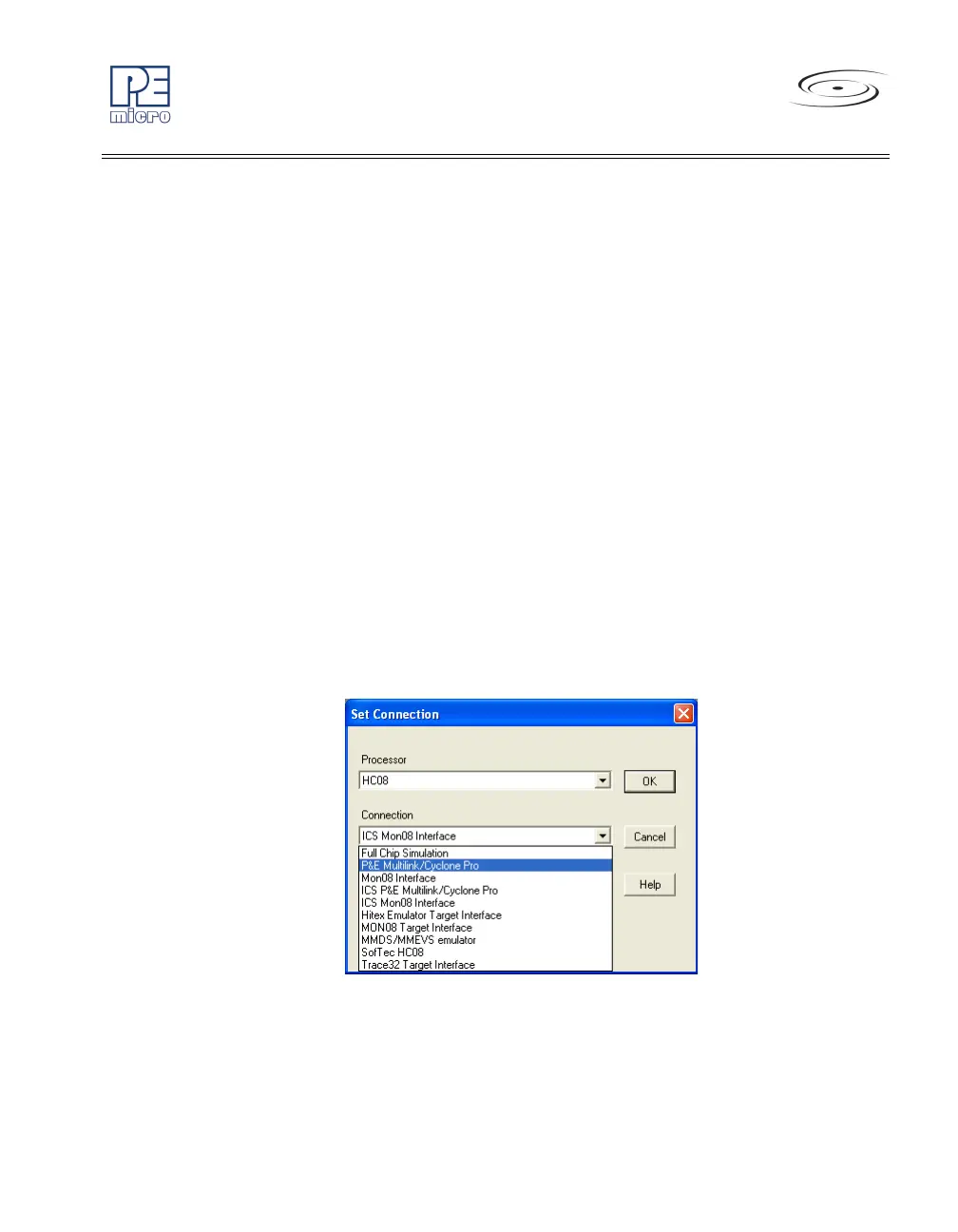 1. Choose the P&E Multilink/Cyclone Pro option from the Set Connec-