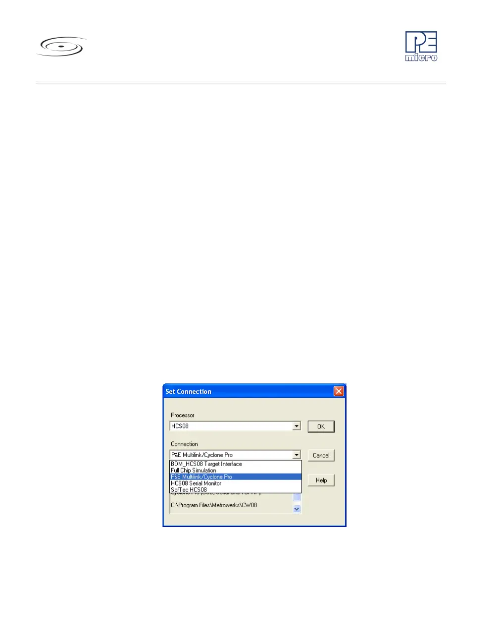 The HCS08 P&E Multilink/Cyclone Pro Connection setting permits a