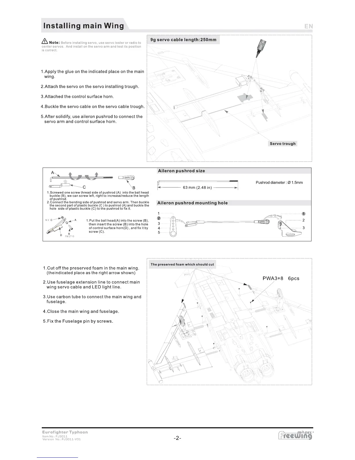 Freewing Eurofighter Typhoon V2 - Installing Main Wing; Aileron Pushrod Size; Aileron Pushrod Mounting Hole