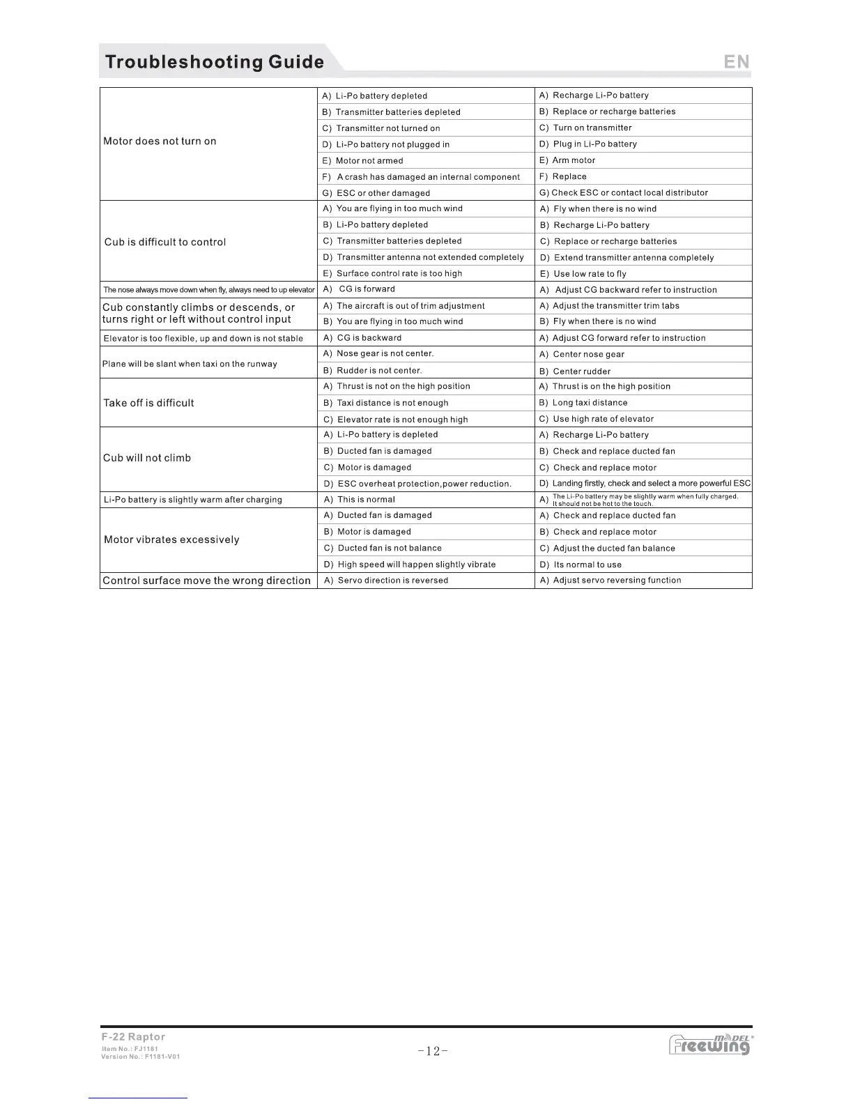 Freewing F-22 Raptor - Troubleshooting Guide; Motor and Control Issues; Flight and Handling Problems; Battery and Vibration Issues