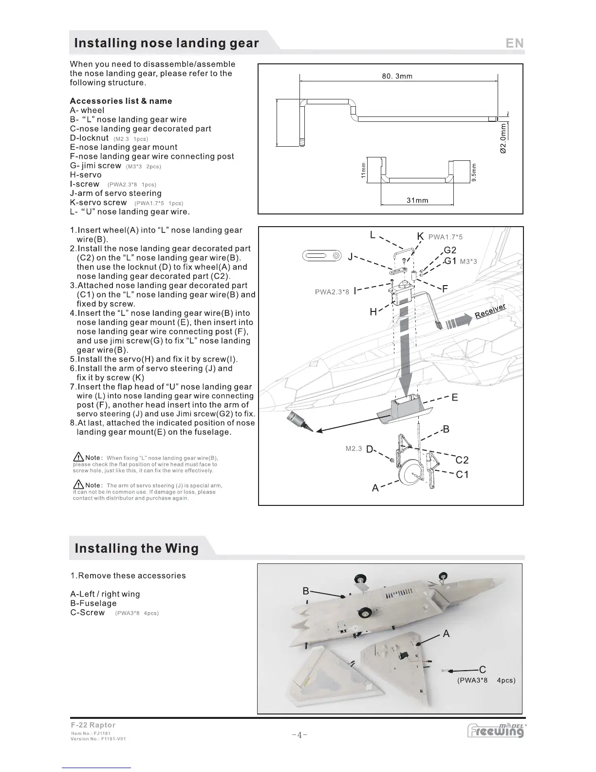 Freewing F-22 Raptor - Installing Nose Landing Gear; Nose Landing Gear Assembly Structure; Nose Landing Gear Installation Steps; Installing the Wing