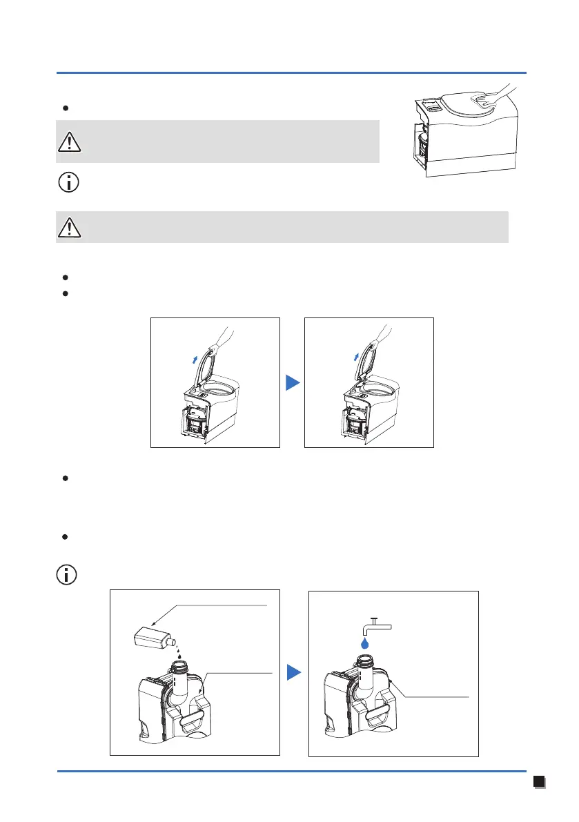 Unscrew the plastic cap directly, add 2 caps (100ml) and 2L of water into the waste-holding