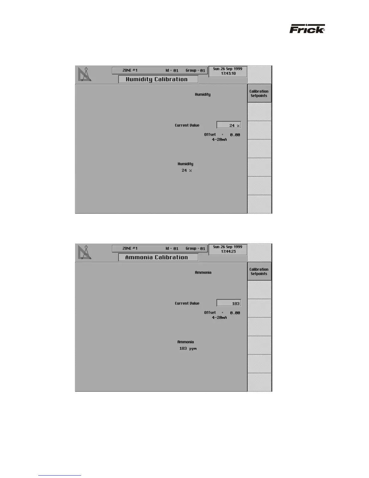 Frick QUANTUM - Analog Calibration - Humidity Calibration Screen; Analog Calibration - Ammonia Calibration Screen