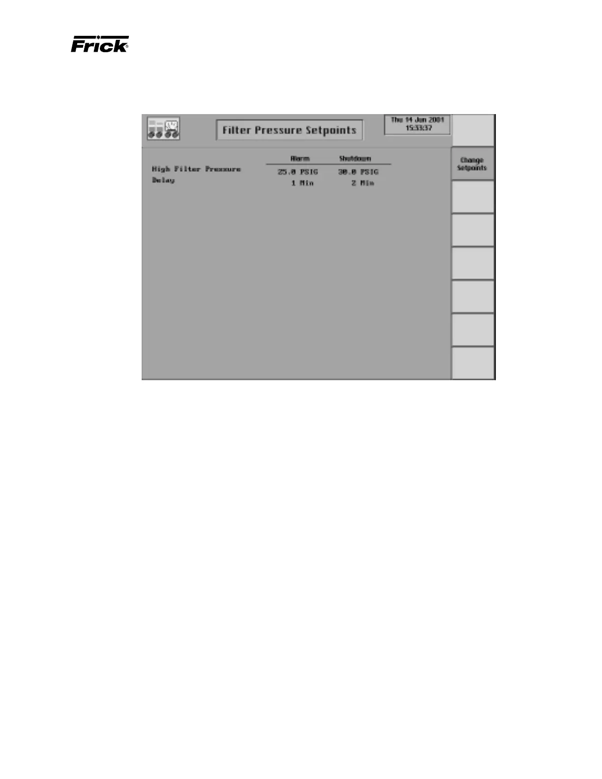 “Filter Pressure Setpoints” screen. The filter value equals