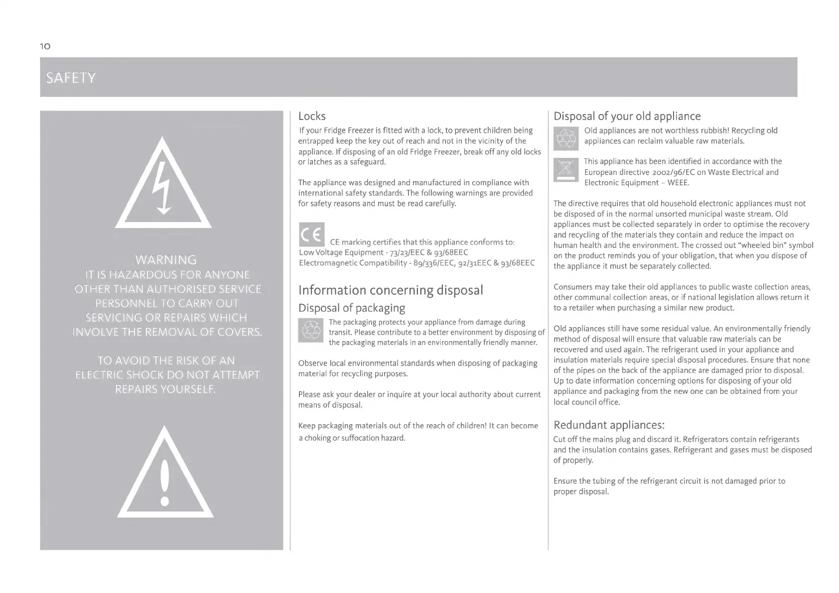 Fridgemaster MC50160 - Information Concerning Disposal; Disposal of Packaging; Disposal of Your Old Appliance; Redundant Appliances