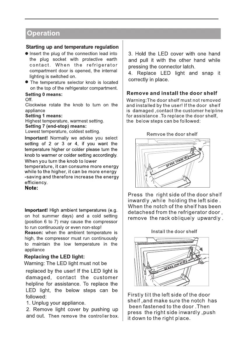 Fridgemaster MC50165F - Operation; Starting up and temperature regulation; Replacing the LED light; Remove and install the door shelf