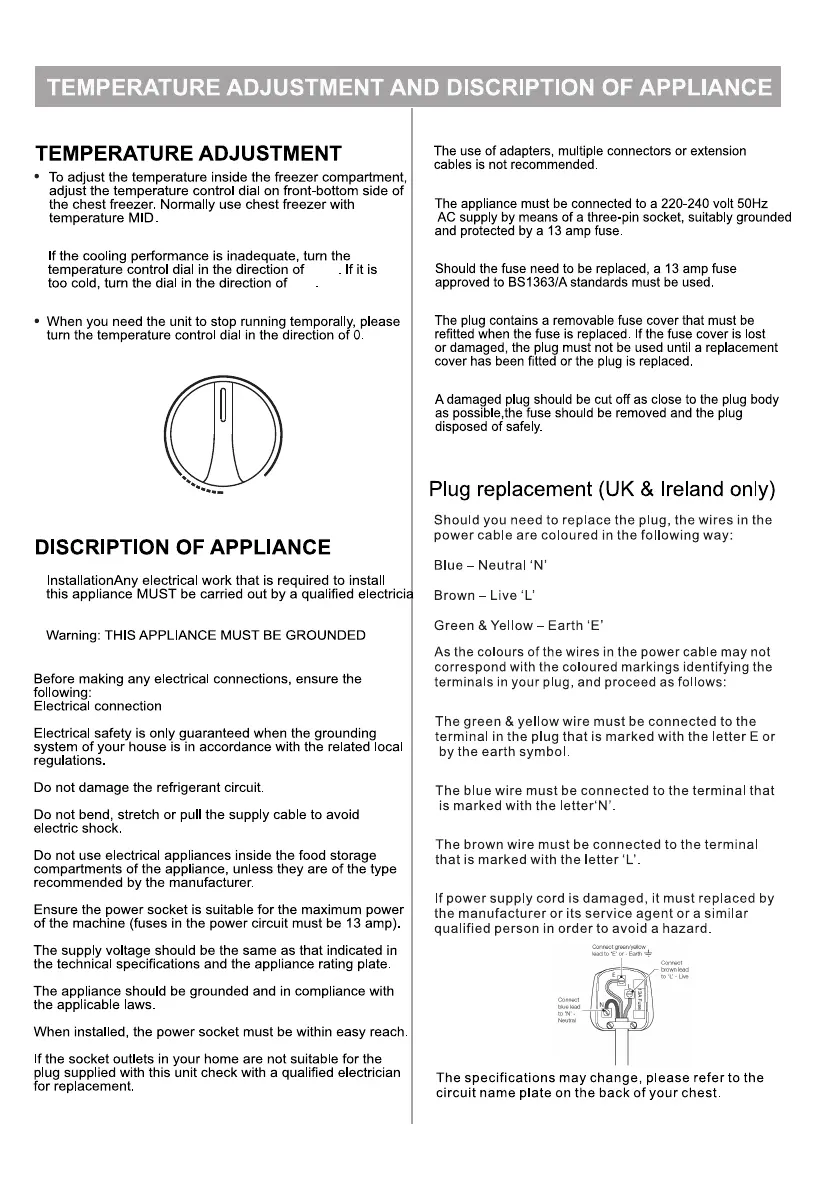Fridgemaster MCF96 - Temperature Adjustment and Appliance Description; Temperature Control Adjustment; Appliance Description and Installation Requirements; Plug Replacement (UK;Ireland)