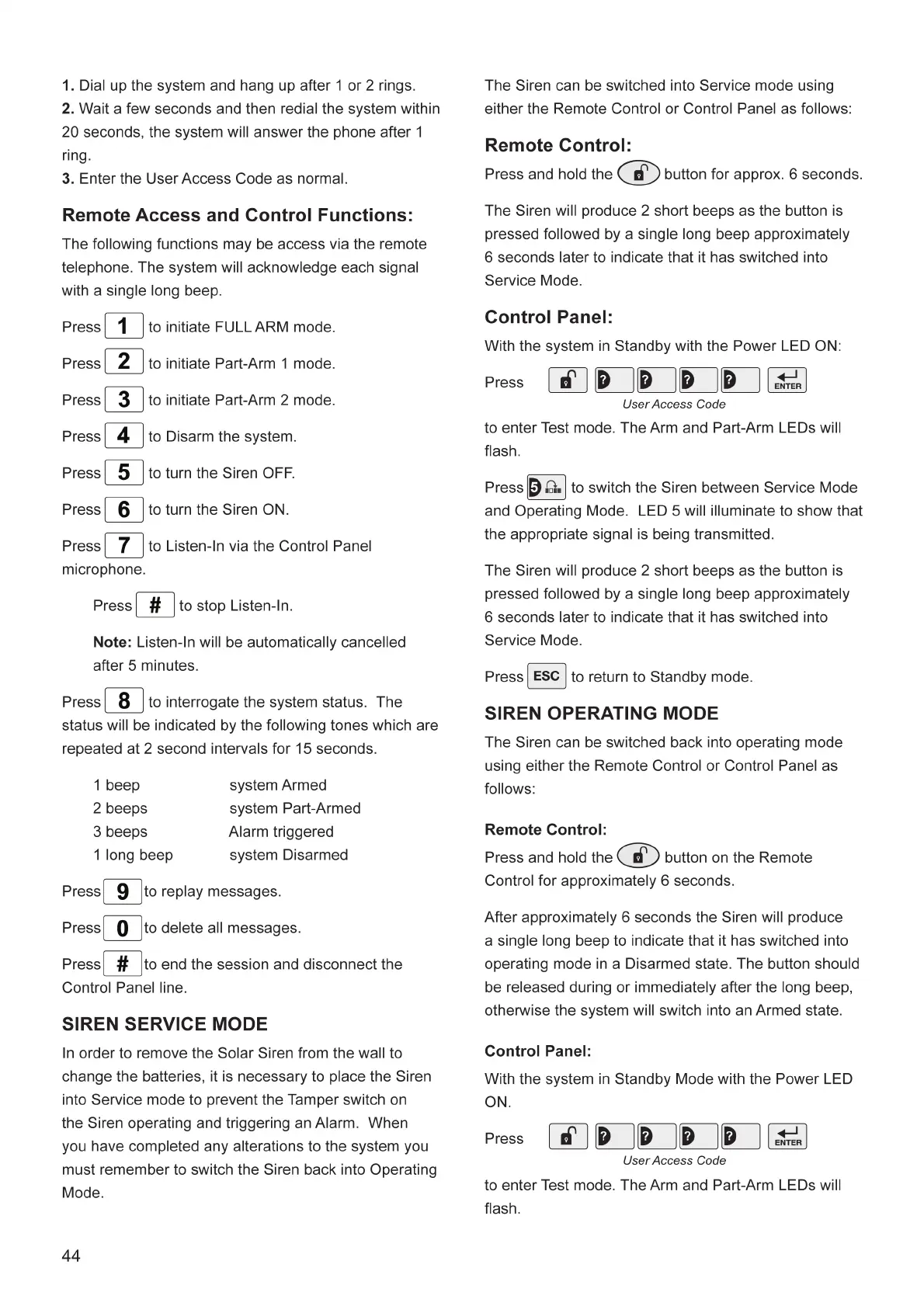 FRIEDLAND SA5 - Remote Access and Control Functions; Siren Service Mode; Siren Operating Mode