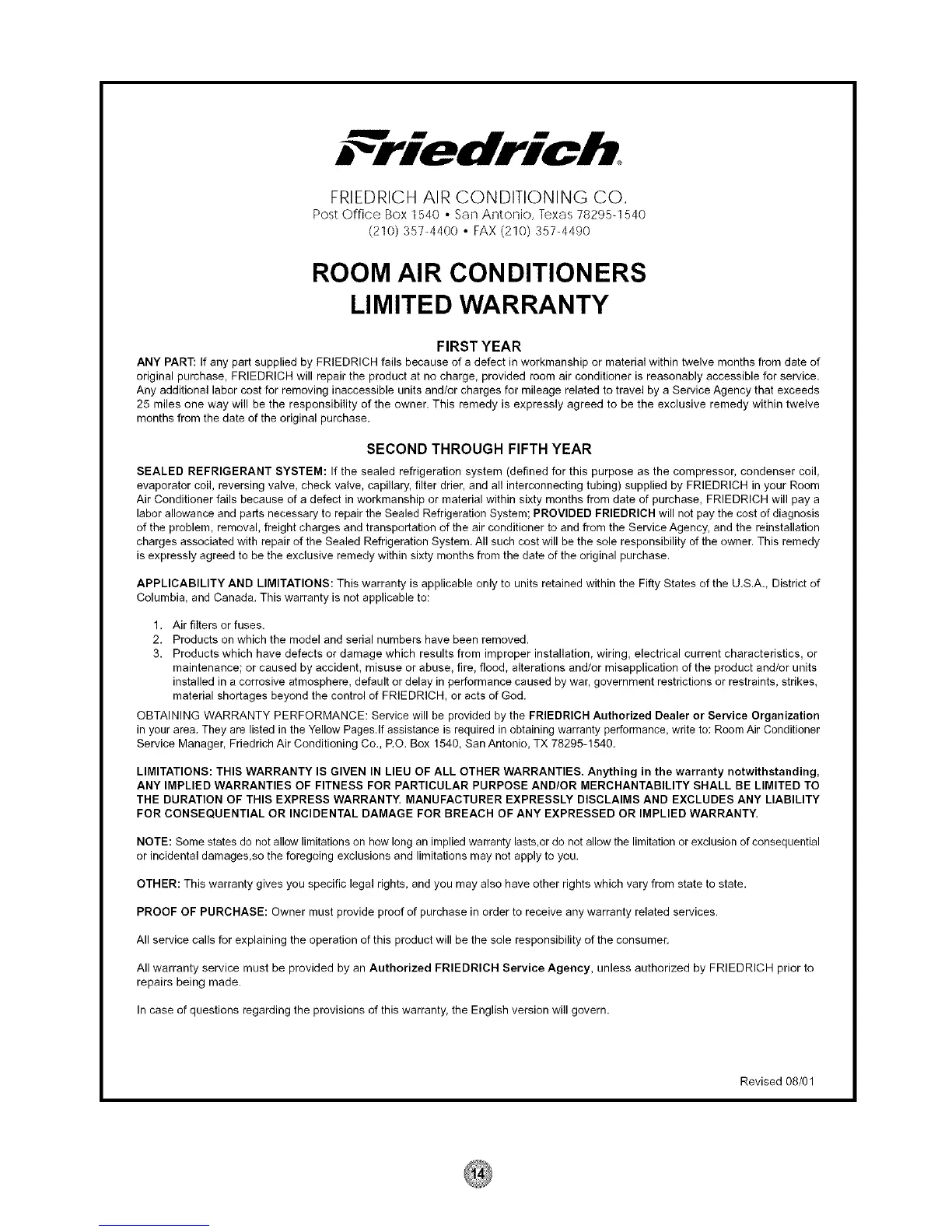 All warranty service must be provided by an Authorized FRIEDRICH Service Agency, unless authorized by FRIEDRICH prior to