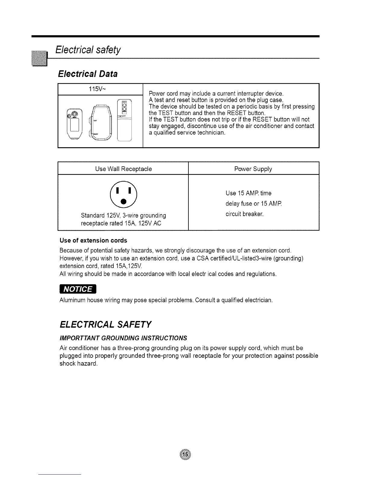 Air conditioner has a three-prong grounding plug on its power supply cord, which must be