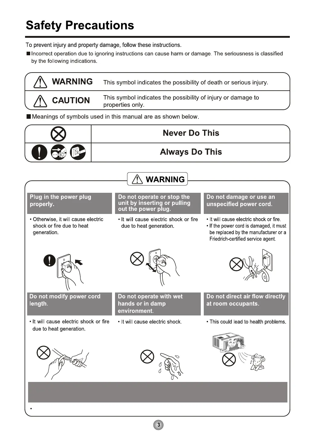 Friedrich EP18G33 - Safety Precautions; Electrical Safety Warnings; Operational and Handling Safety