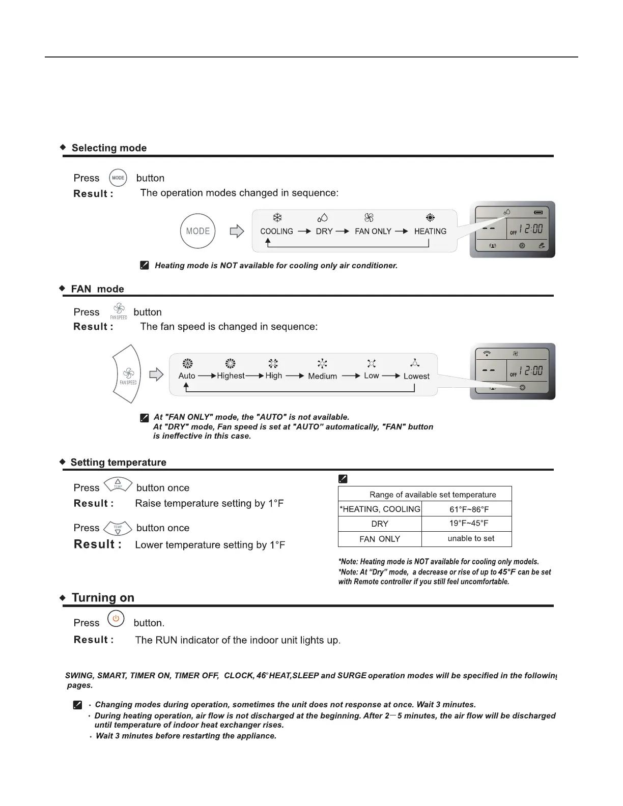Friedrich FPHFC36A3B Wi-Fi - Operation Modes