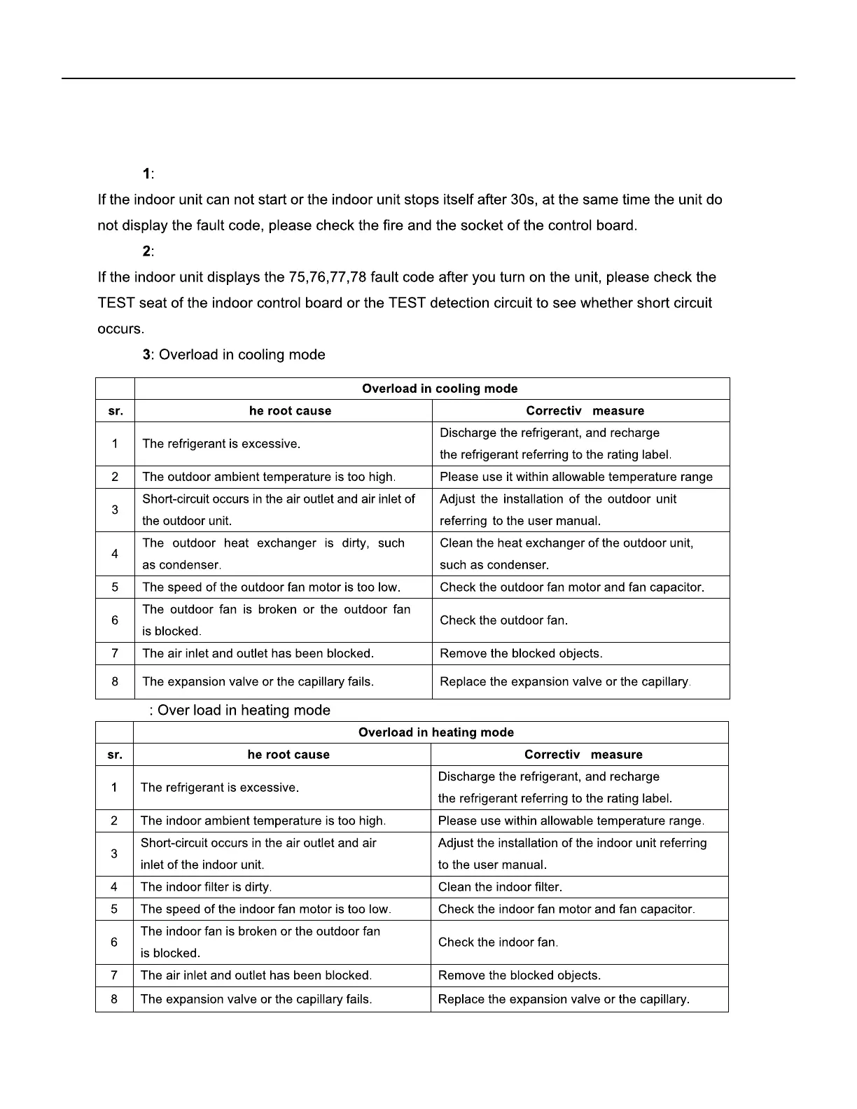 Indoor Unit Fault Codes