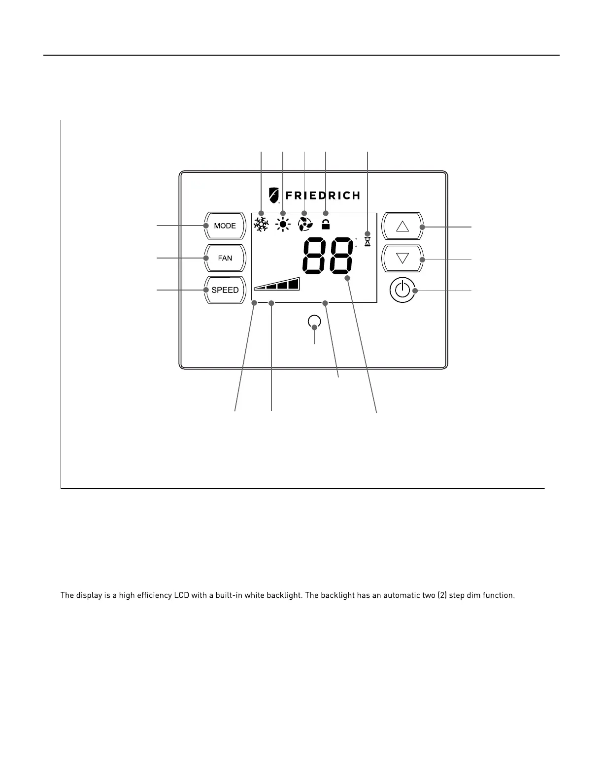 The backlight on the push buttons will automatically dim to 20% intensity after 15 seconds of inactivity.