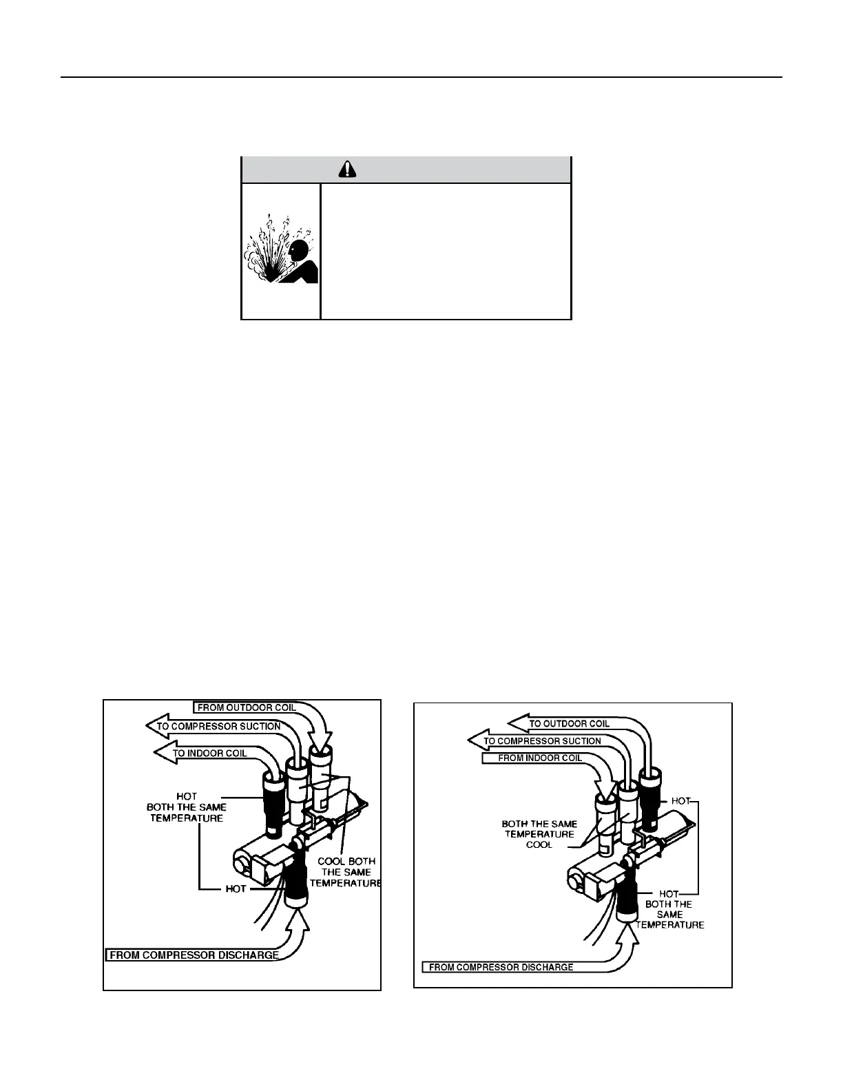 If the valve is stuck in the heating position, block the air ow through the indoor coil and allow discharge pressure