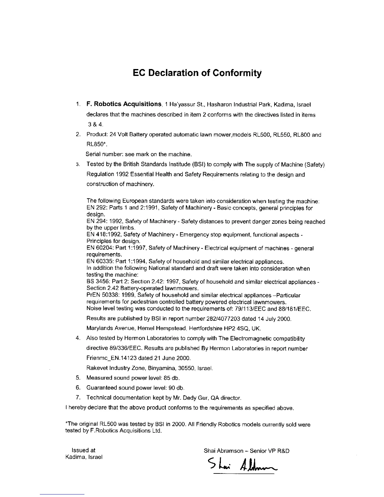 *The original RL500 was tested by BSI in 2000. All Friendly Robotics models currently sold were