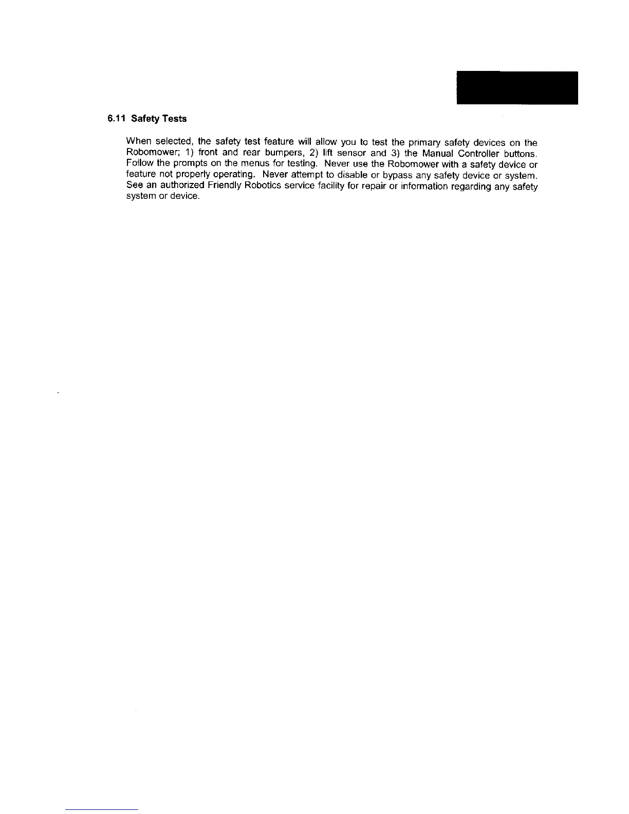 Follow the prompts on the menus for testing. Never use the Robomower with a safety device or