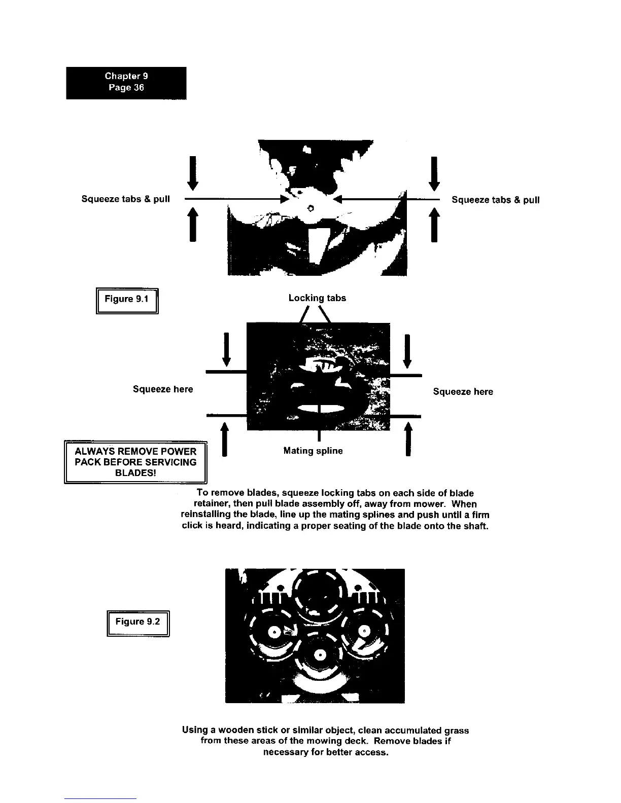 from these areas of the mowing deck. Remove blades if