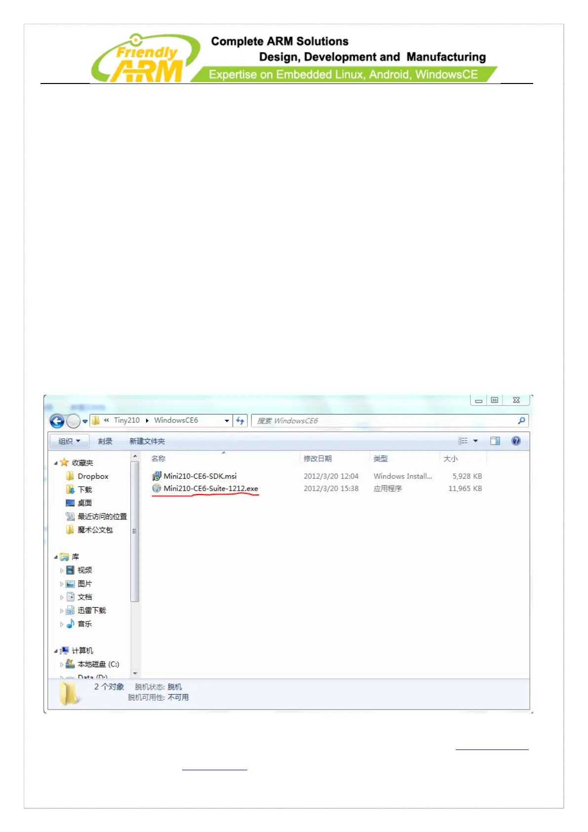 The Tiny210’s BSP has only one installation file Mini210-CE6-Suite-1212. Belwo are