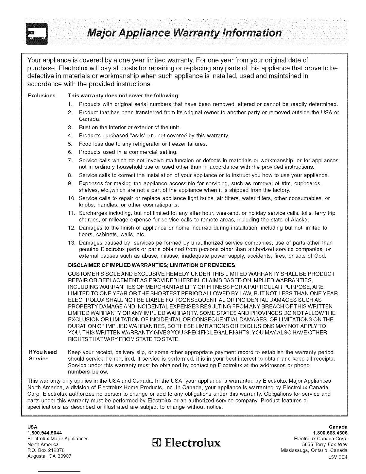 North America, a division of Electrolux Home Products, Inc. In Canada, your appliance is warranted by Electrolux Canada