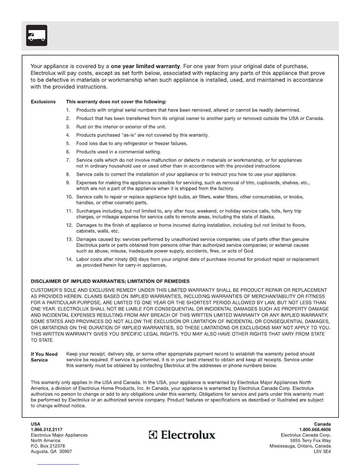 Frigidaire 316495003 - Warranty Information; Warranty Exclusions List; Warranty Limitations and Remedies; Service and Support Contacts