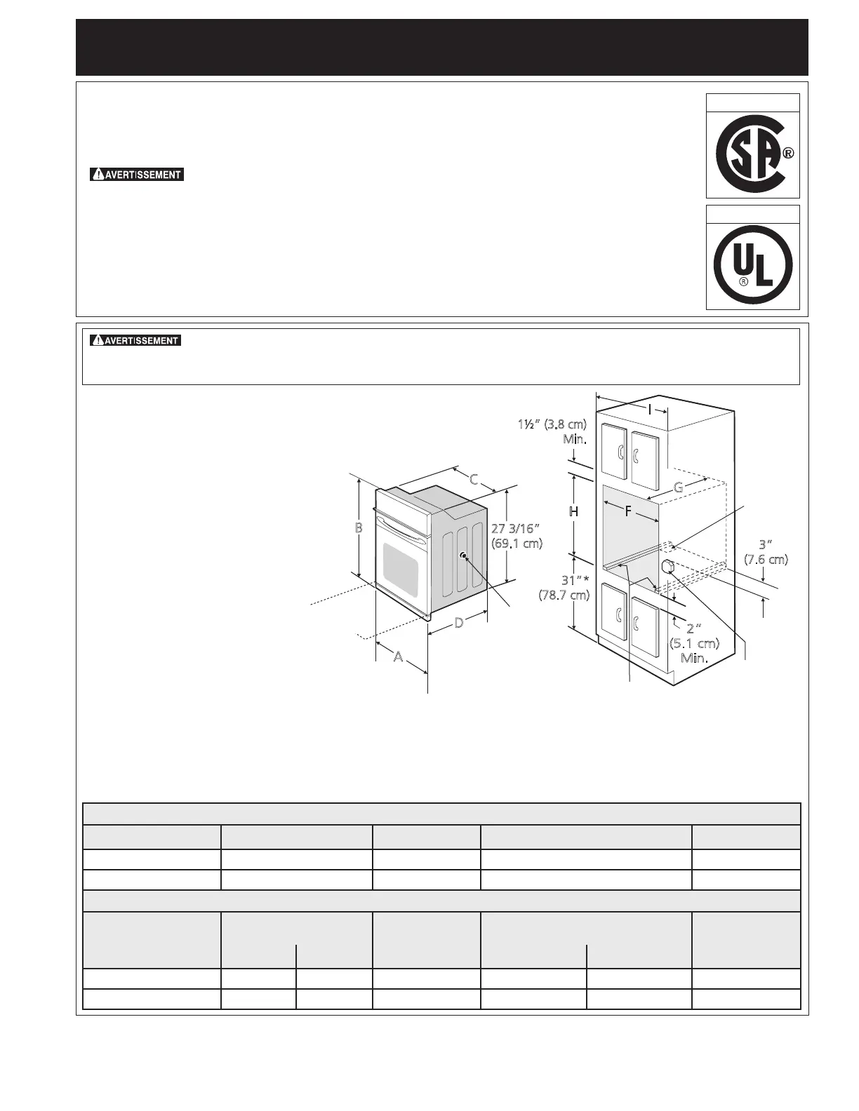 Fours encastrés simples 27" et 30" (Pour les fours encastrés doubles voir la figure 2)