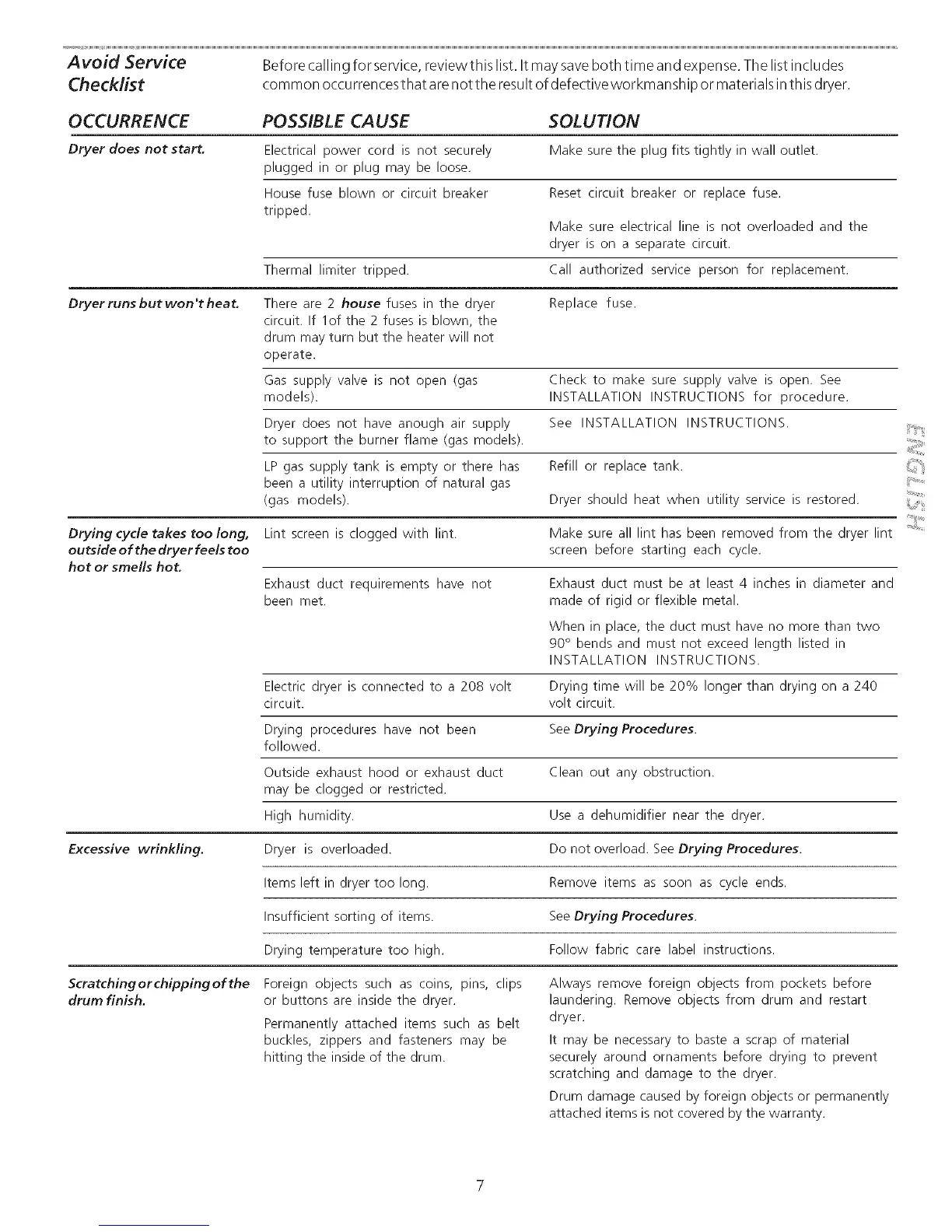 Checklist common occurrences that are not the resu It of defective workmanship or materials in th is dryer.