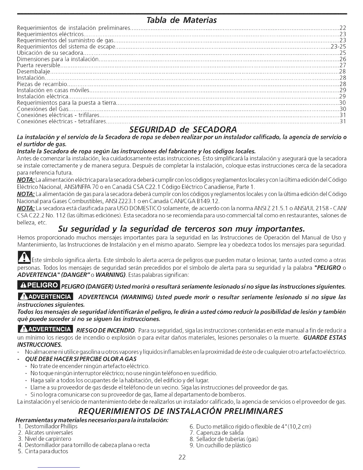 Ubicaci6n de su secadora ................................................................................................................................................... 25