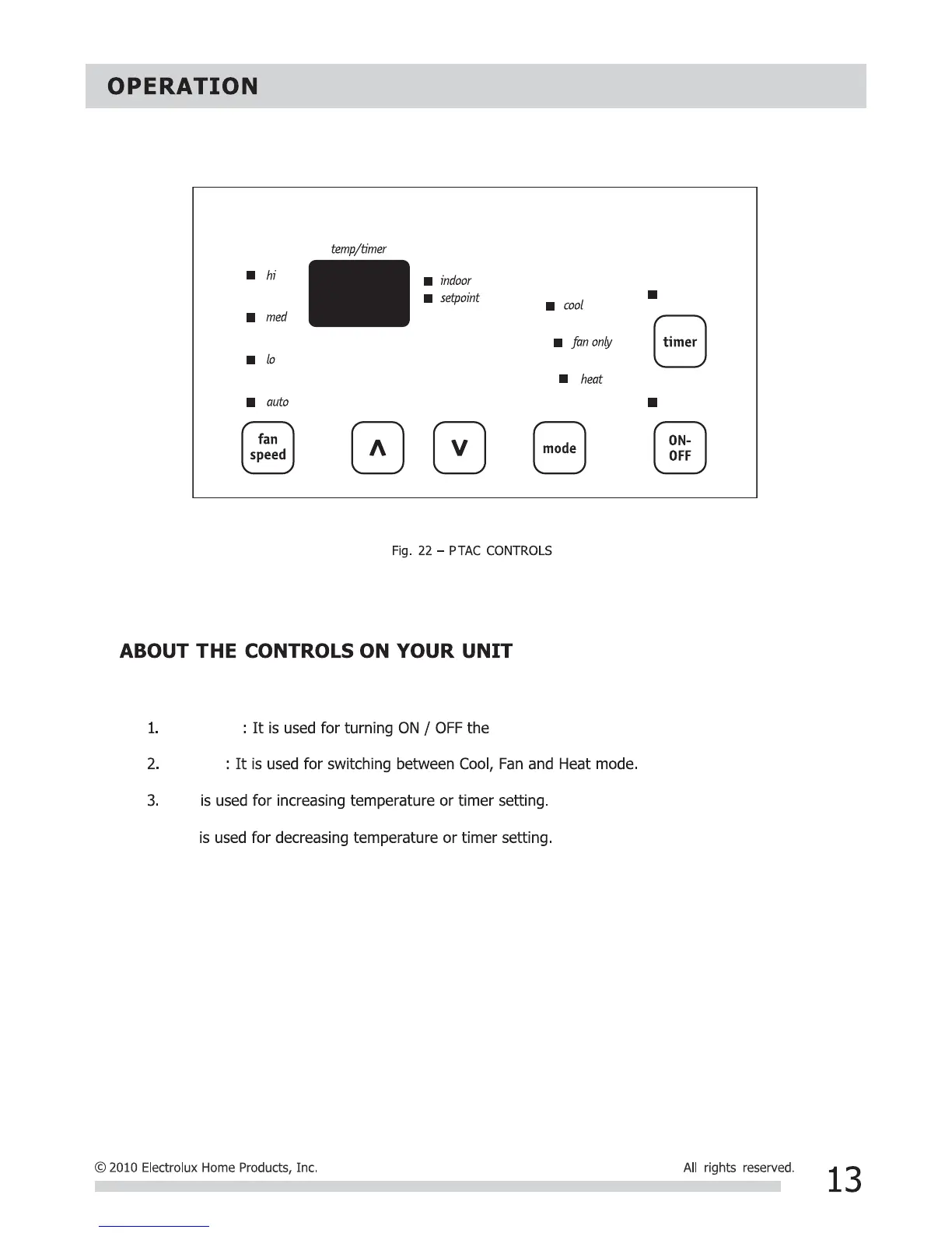 Frigidaire Air Conditioner - Operation; About the Controls on Your Unit