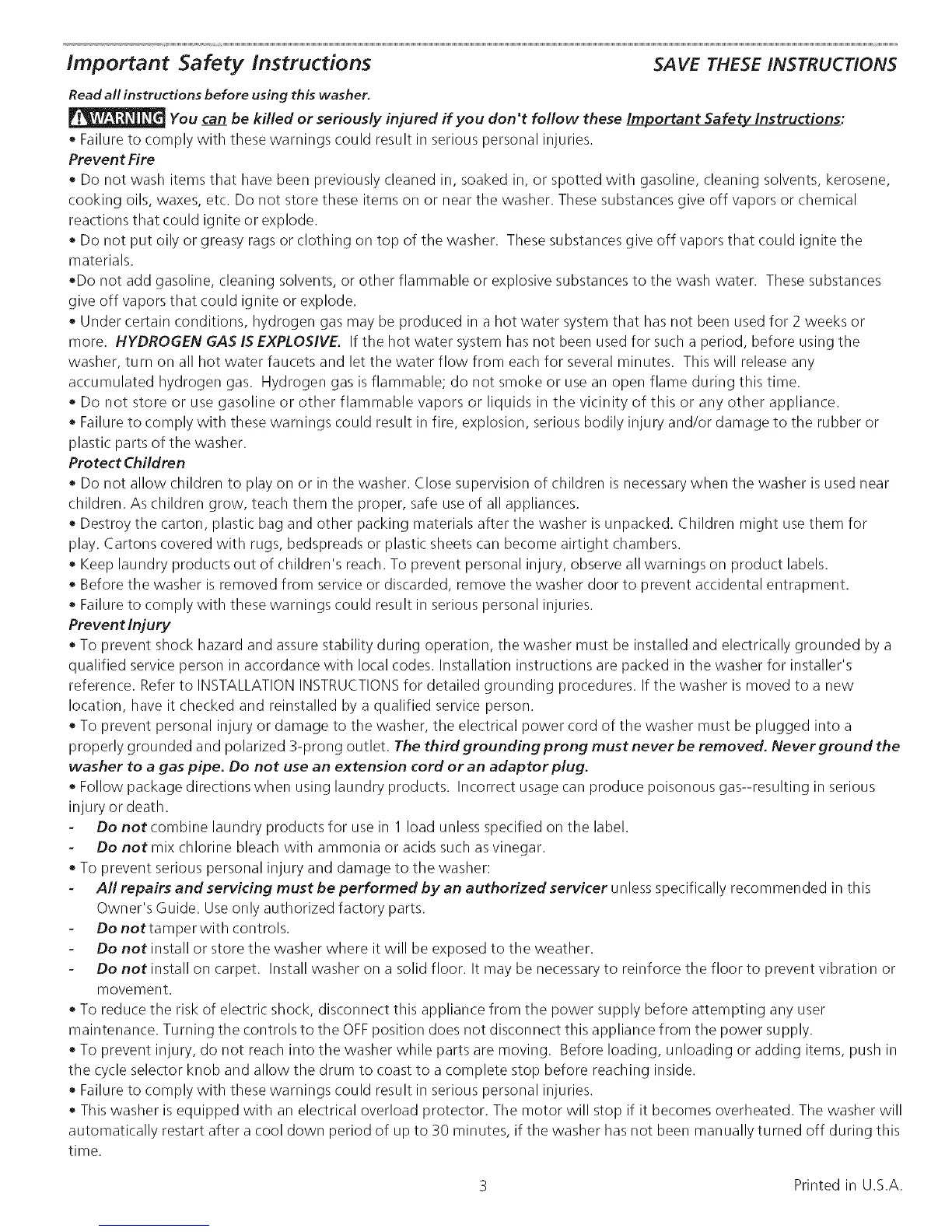 • Do not wash items that have been previously cleaned in, soaked in, or spotted with gasoline, cleaning solvents, kerosene,