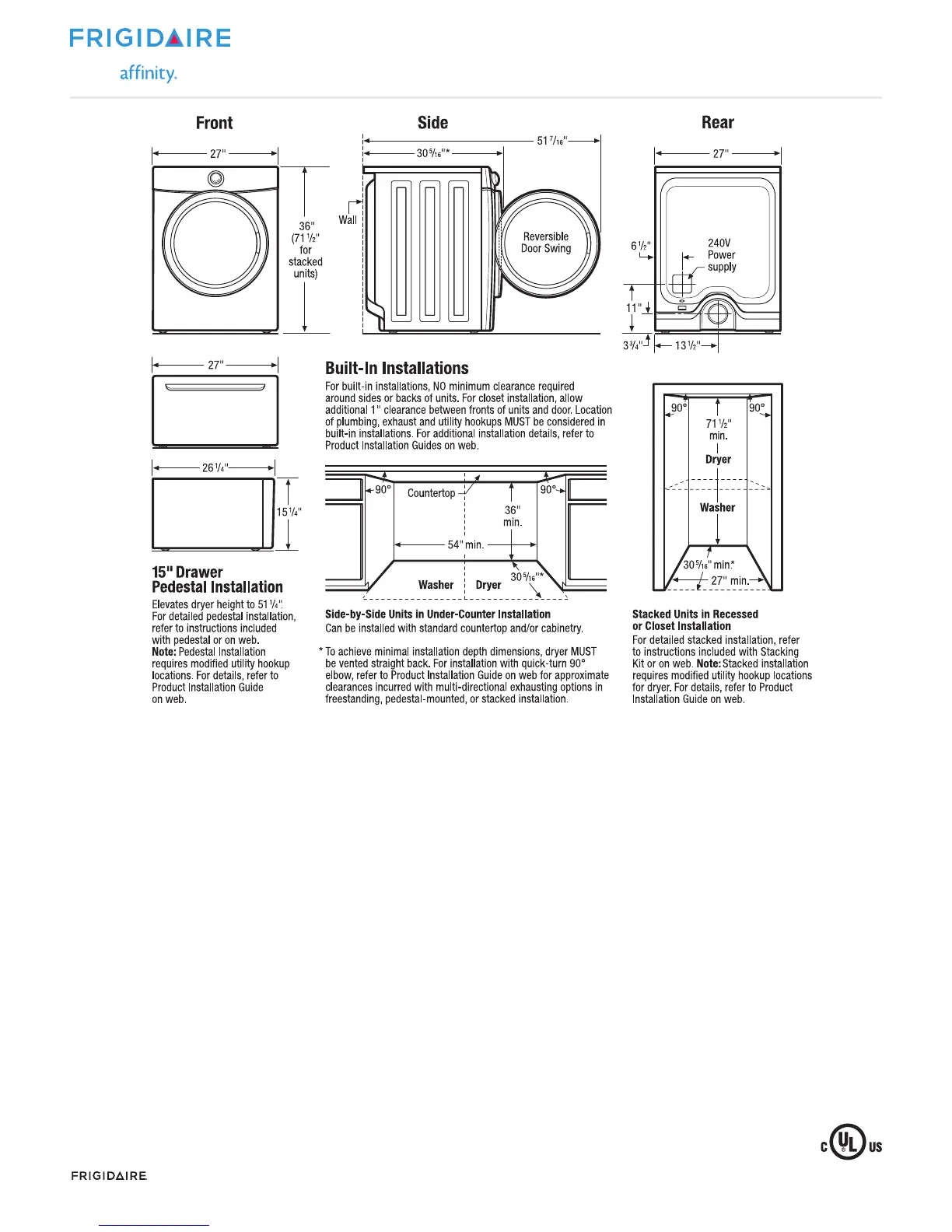 or stacked above matching Frigidaire® Affinity Washer, which requires