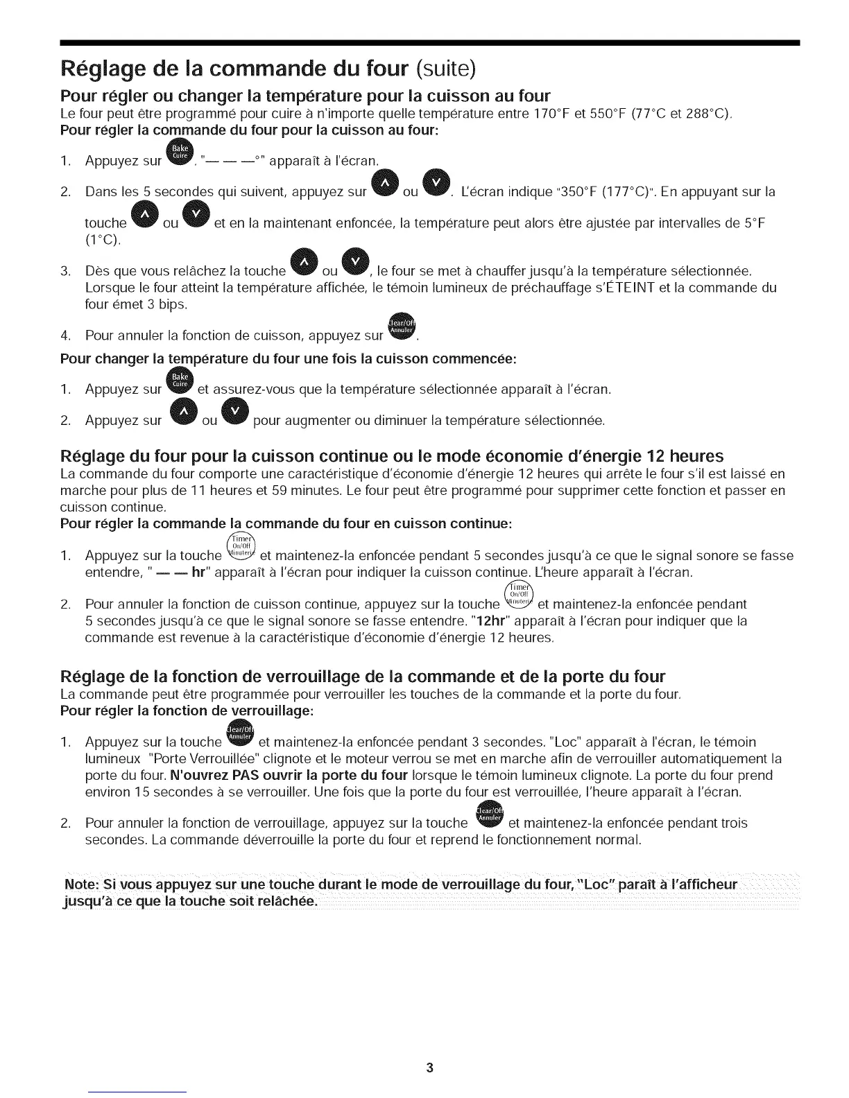 Note: Si vous appuyez sur une touche durant le mode de verrouillage du four,"Loc, parait a I'afficheur