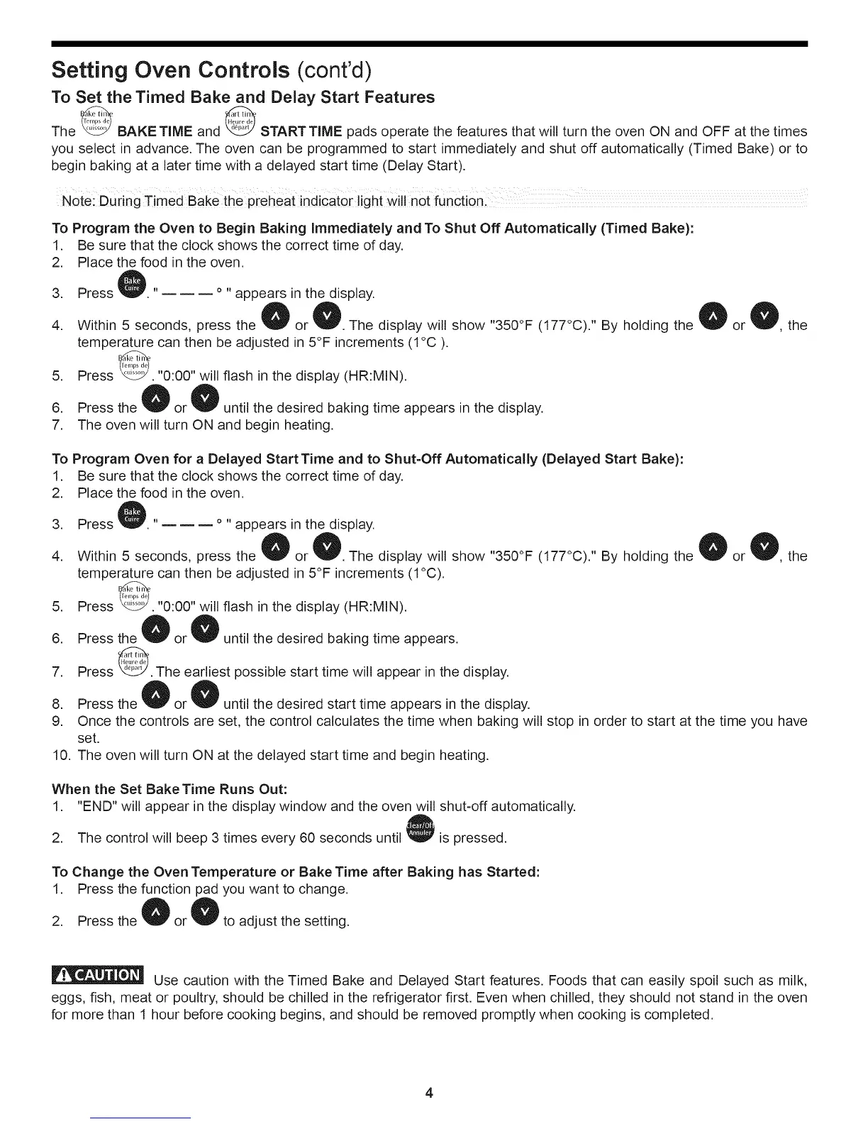 Use caution with the Timed Bake and Delayed Start features. Foods that can easily spoil such as milk,